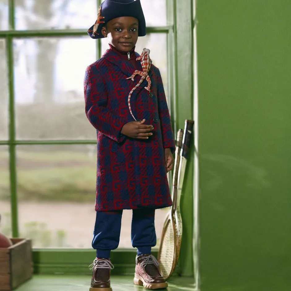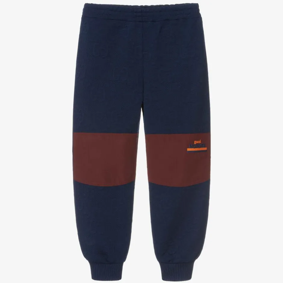 Inspired by vintage sportswear, a pair of navy blue joggers for boys by luxury Italian designer, Gucci. Made in soft jacquard jersey with the brand's distinctive diamond GG logo pattern, they have a comfortable elasticated waistband and cuffed ankles. Eye-catching dark red panels on the knees are embroidered with 'Gucci Monster' in orange and blue, as featured in the latest children's collections.