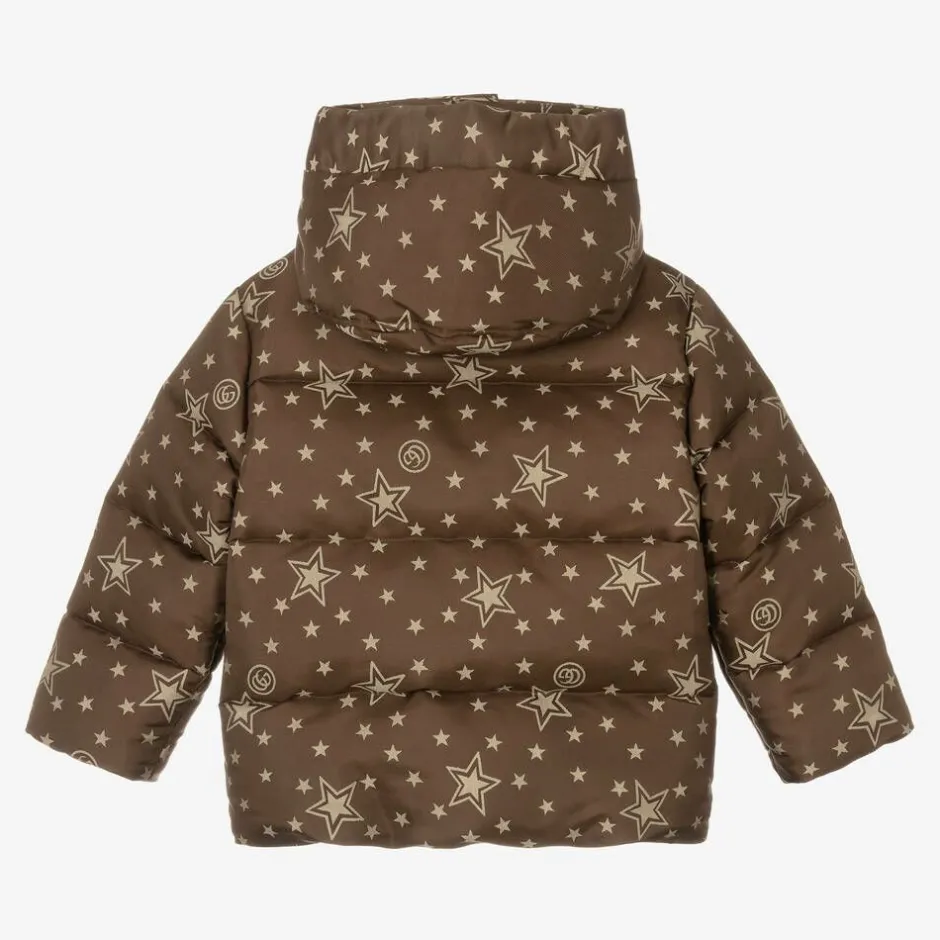 A brown puffer jacket for boys from Italian designer Gucci, padded with warm and luxurious down. Soft and smooth, the fabric is signed with intricately woven jacquard stars and Double G branding in beige, making this a true statement piece. Helping to protect him from the elements are the elasticated cuffs and hem, a large hood which fastens with velcro on the front, and cotton-lined pockets. Lined with silky fabric, it fastens with a branded silver-tone front zip for simple dressing.