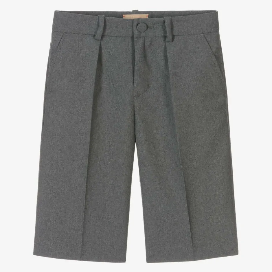 Smart grey shorts for boys from Italian designer Gucci, made from luxurious wool. In a traditional Bermuda style, they are beautifully tailored with slanted pockets and pleats on the front. They fasten with a zip and covered button and have an adjustable waist with belt loops for a great fit. There is a welt pocket on the back and an embroidered logo label for a discreet designer finish.