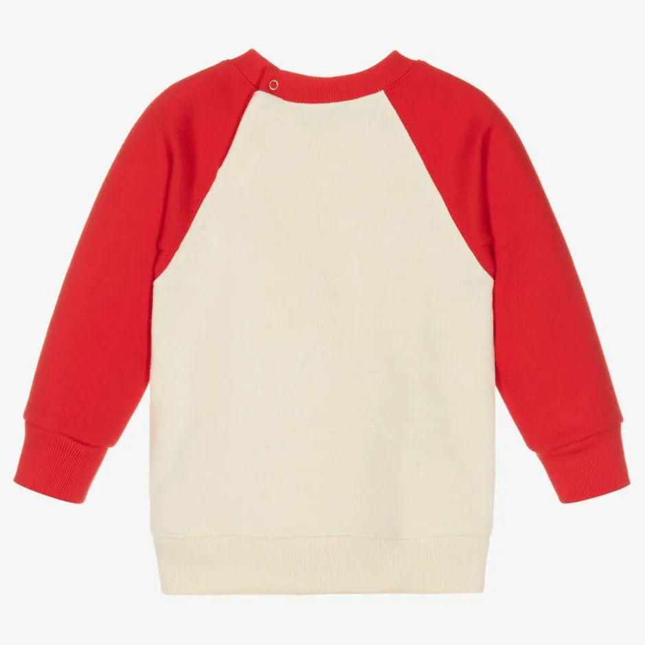 From luxury brand Gucci, an ivory cotton sweatshirt for little boys. It is crafted in soft, medium-weight jersey with red raglan sleeves and softly ribbed trims. This casual design is enhanced by the Italian label's black logo print, with 'Band' lettering, an embroidered Interlocking G motif, and torchon detail in the iconic red and green Web. It fastens easily on the back with concealed poppers.