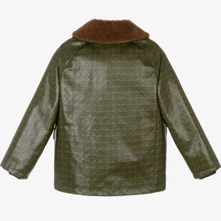 A dark green jacket for boys and girls from Gucci, crafted in a cotton mix. The brown fluffy shearling collar and smooth coated fabric provide interesting uses of texture on this luxurious jacket. In the label's signature boxy silhouette, this classic-meets-modern piece is enhanced by Double G Geometric branding and logo buttons on the front and patch pockets. It is lined with gentle-on-the-skin cotton and the ribbed cuffs are knitted in cosy wool. Logo engraving on the front zip adds that extra designer detail.