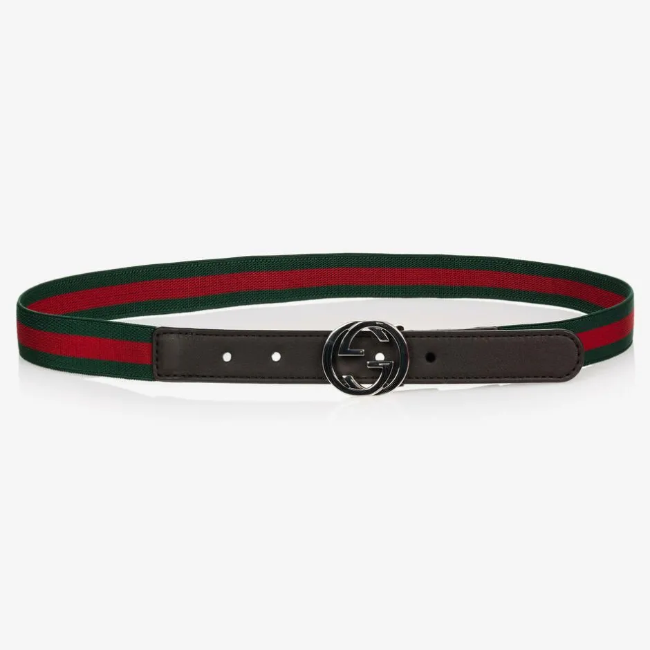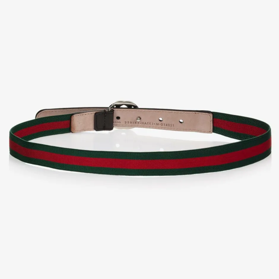 Green and red Web elasticated belt from luxury brand Gucci for boys and girls. It has brown leather trims and a silver Double G buckle for a timeless finish.