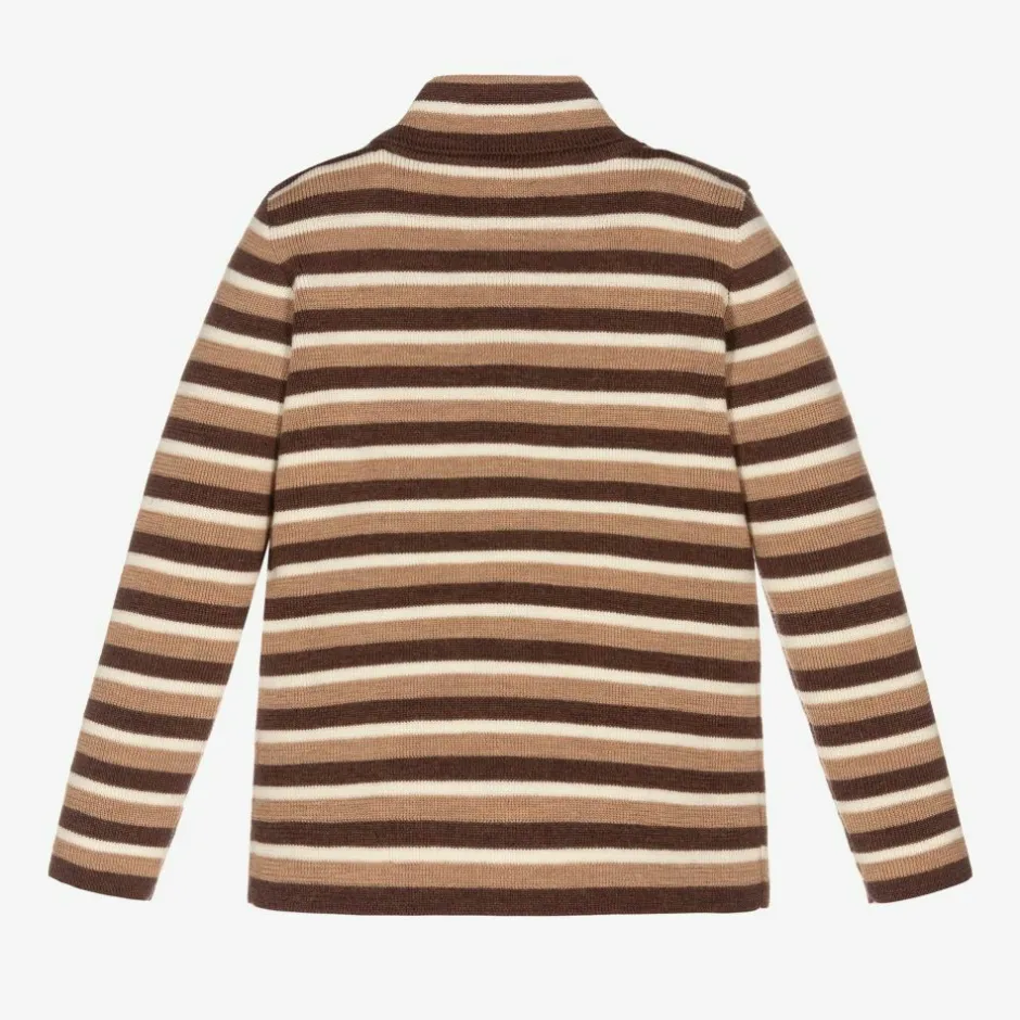 Younger boys and girls wool roll neck sweater by luxury brand, Gucci. Forming part of the Ouverture collection, this retro-inspired knit in ivory, brown and camel stripes is soft and stretchy, with an intarsia weave of the design House's classic logo in dark brown.