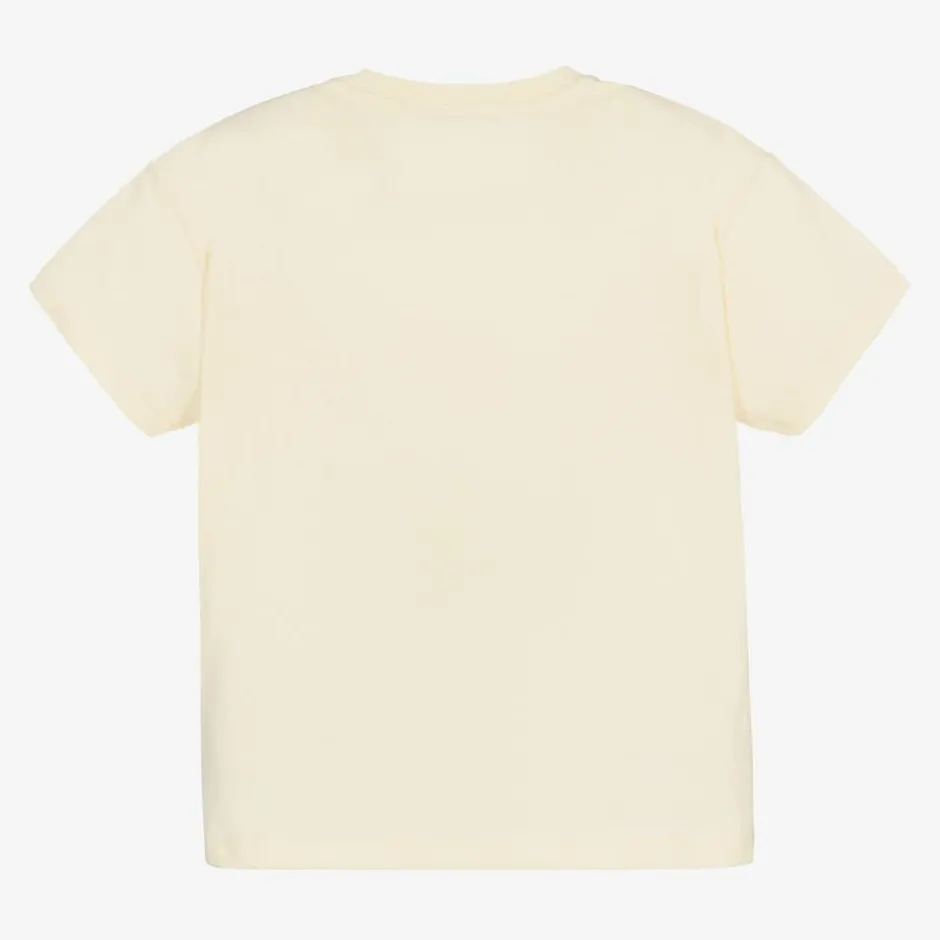 Ivory T-shirt for little boys and girls by renowned luxury brand Gucci, made from soft cotton jersey. The fun cartoon print on the front features the beloved characters of The Jetson family, alongside a multicoloured Gucci logo print. It has a lightly ribbed crew neck and popper fastenings on one shoulder to help with dressing.