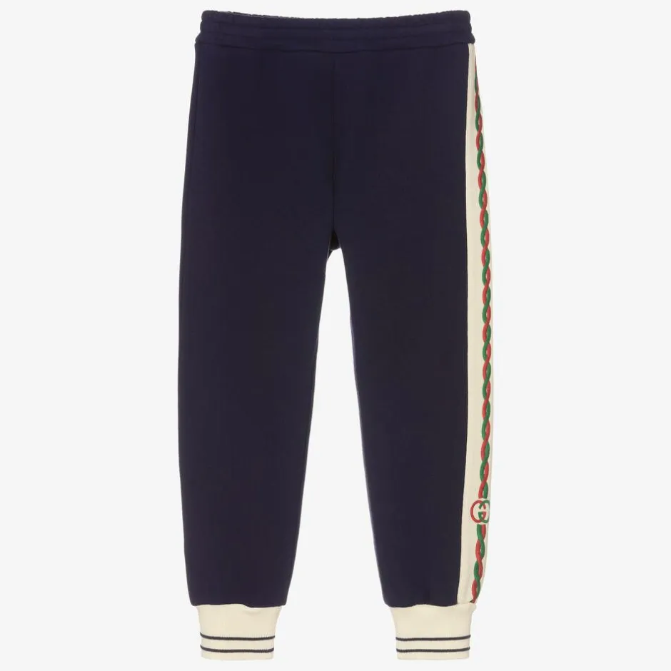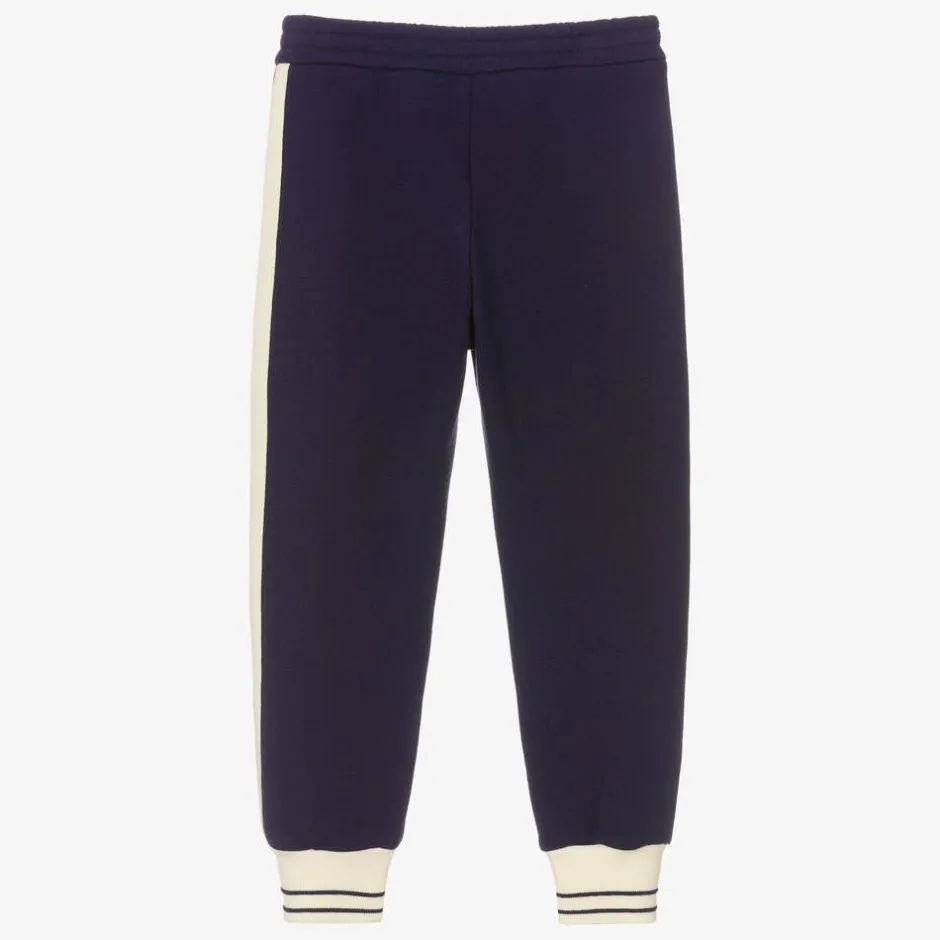 Casual navy blue joggers for boys and girls, by luxury Italian designer Gucci. Trimmed with sporty ivory stripes on the sides, they have a red and green striped detail on the sides, incorporating the iconic interlocking G logo embroidery. The stretchy waist makes these joggers comfortable, and the striped trims on the cuffs give them a retro feel.