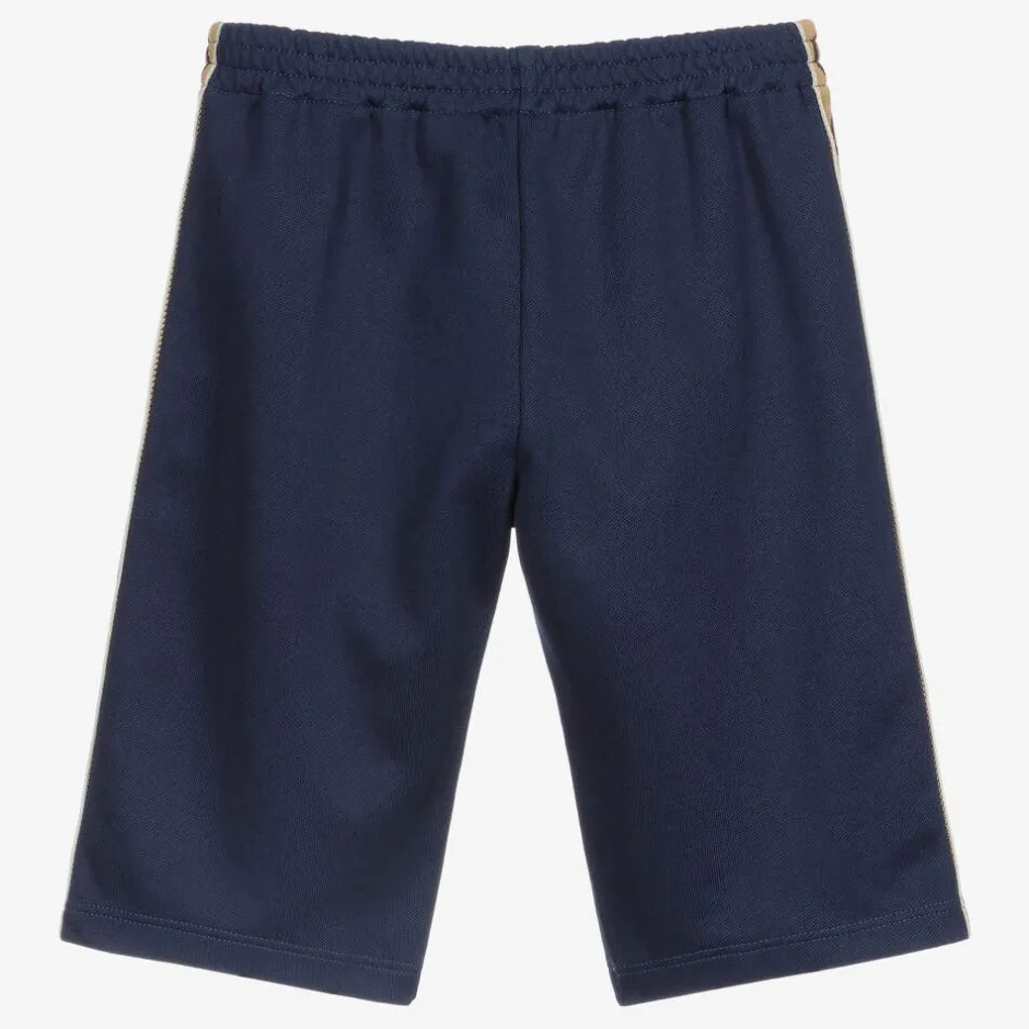 Navy blue shorts for little boys by luxury Italian brand Gucci, made in technical jersey. They have seams on the front and Interlocking G logo jacquard trims in beige and brown on the legs.