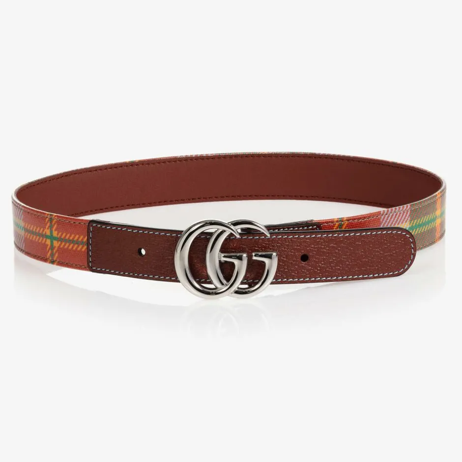 Red belt for boys and girls from Italian brand Gucci, lined in smooth brown leather with contrast blue stitching. This luxury accessory is made with the designer's signature Supreme canvas in red, green and blue check. Distinctively Gucci, it fastens with a silver Double G logo pin buckle on the front.