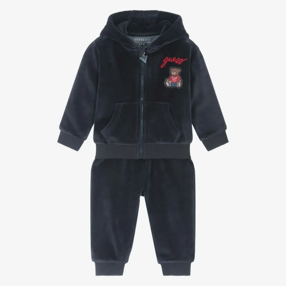 Navy blue velour tracksuit for baby boys from Guess, made in super soft cotton-blend velour. The hooded zip-up top has front pouch pockets and the joggers have a single pocket on the back. Both pieces have comfortable ribbed trims and feature the brand's red embroidered logo and teddy bear patch. Contains organic cotton fibre.