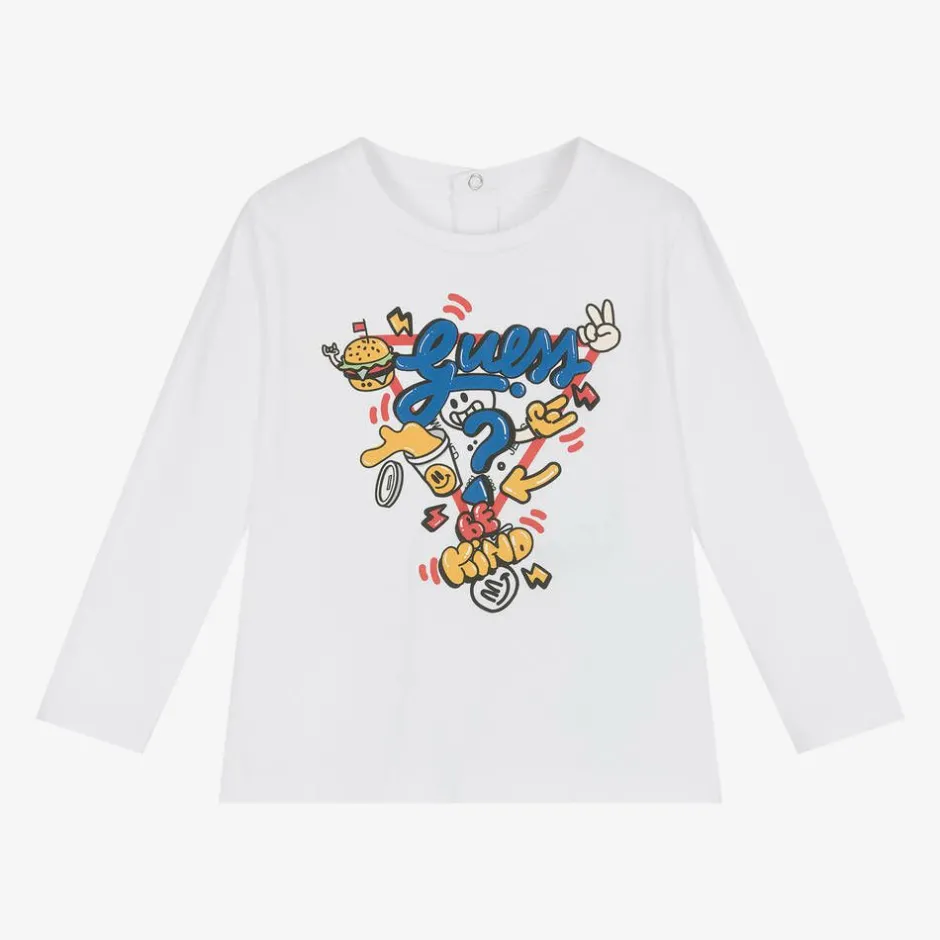 A white long-sleeved cotton top for baby boys by Guess. For a good vibe, the front has a colourful print of the iconic triangle logo in a fun cartoon-style graphic and 'be kind' slogan. The popper fastenings on the back allow easier dressing. This casual jersey top contains organic cotton fibre.