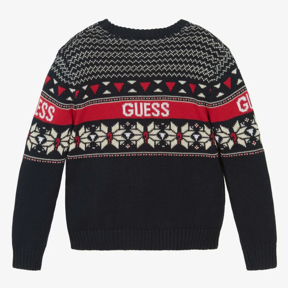 From Guess for younger boys, a lovely navy blue jumper. Knitted in soft cotton, it has a Fair Isle-style pattern which includes the brand's Triangle logo and name for brand recognition. This item contains organic cotton fibres.