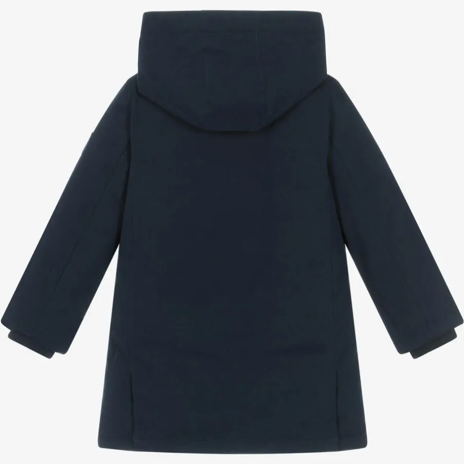 A classic navy blue parka coat for boys by Guess, with a beige faux fur trim and silky lining. Down-padded for extra warmth, this mid-weight coat has a hood that detaches with a zip for an alternative look. It fastens with a zip and poppers on the front, has useful flap pockets, and an iconic rubberised Triangle logo on one sleeve.