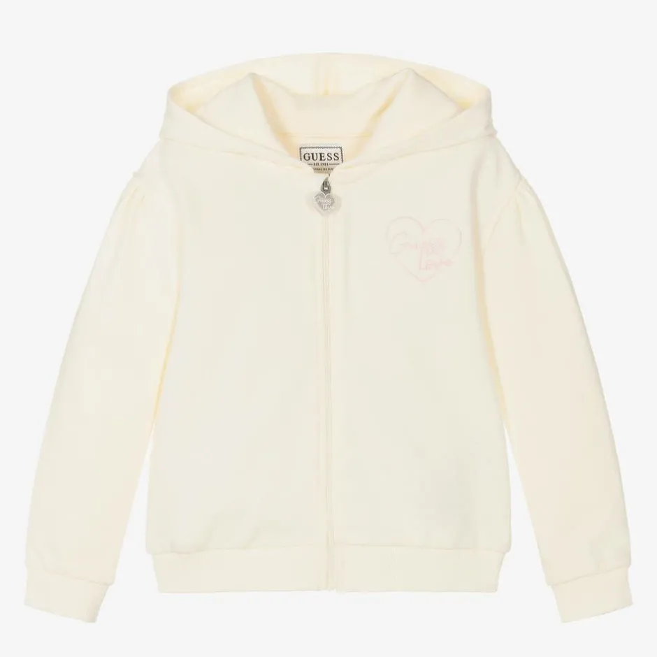 An ivory zip-up top for girls by Guess, made in soft, mid-weight cotton jersey. This cool hoodie is styled with dropped shoulders and decorated with pink heart embroidery on the front and back. 'Guess love' is stitched within the heart motifs for extra designer appeal. It fastens with a heart-shaped zip on the front. This garment contains organic cotton.