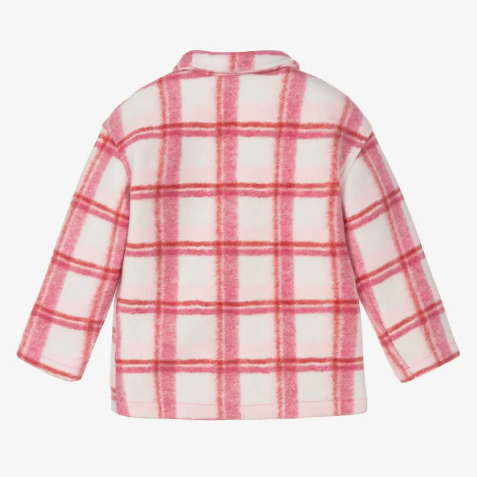 A pink, red and white shacket for girls by Guess, in soft, felted fabric with a jersey underside. This lovely jacket has patch pockets, front button fastenings, and a checked pattern for that classic look. The designer's logo patch is stitched above the hem to complete the look.