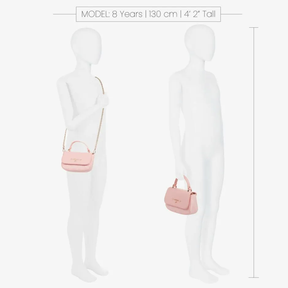 A pretty pink handbag for girls from Guess, made in durable faux leather. The main body of the bag has a woven canvas appearance with the designer's 4g logo and the magnetic popper fastening flap is plain pink for a stylish contrast. A detachable long gold chain allows the bag to be carried on the shoulder for an alternative look.