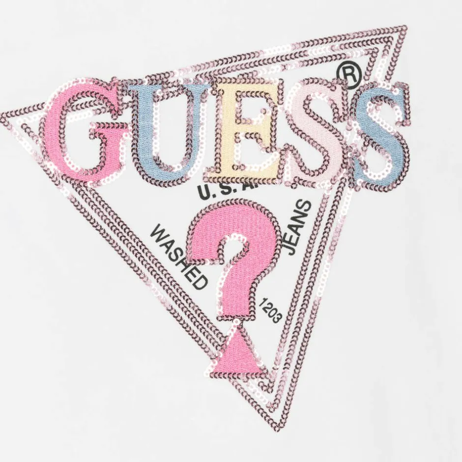 A white long-sleeved top for older girls by Guess. It has a shiny pink sequinned Triangle logo stitched to the chest with embroidered detailing in pretty pastel hues, for a signature branded style. Comfortable to wear, it is made from soft cotton jersey. This item contains organic cotton fibres.