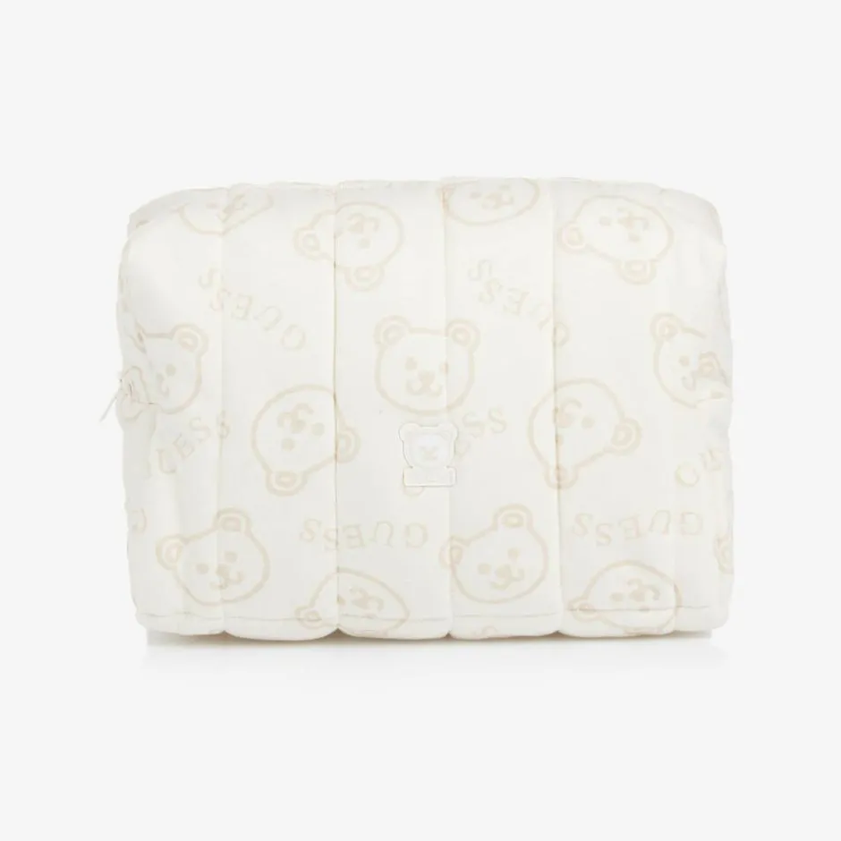 Ivory cotton jersey wash bag by Guess, with an all-over beige teddy and logo print. It is softly padded and has two internal slip pockets to help with organisation. There is an easy zip fastening, with a cute teddy logo appliqué on the front. This item contains organic cotton fibres.