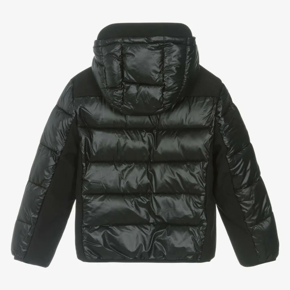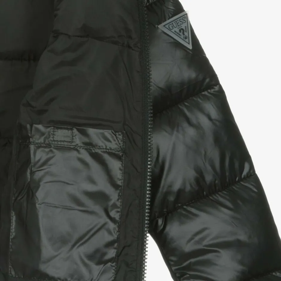 From Guess for Junior boys, a black puffer jacket padded for added warmth. This comfortable hooded jacket, is made from smooth silky material with matte panels for a subtle contrast and finished with a rubberised Triangle logo.