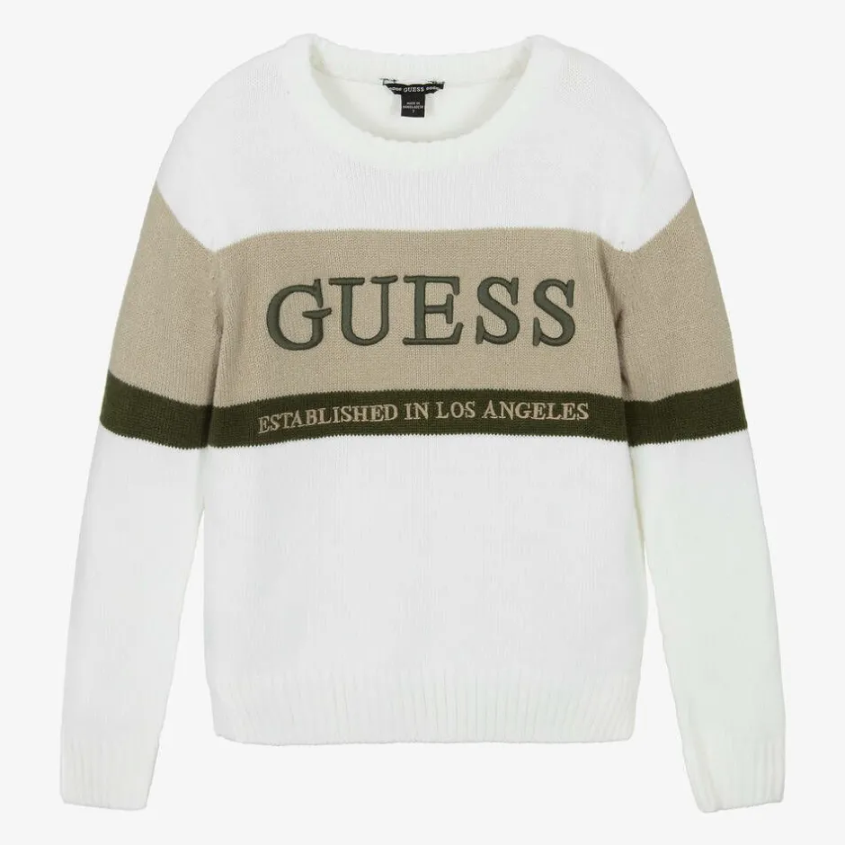 From Guess for junior boys, a white knitted jumper. Casually styled, this tight-knit jumper has ribbed trims on the neckline, cuffs and hem to keep warmth in whether worn separately or layered. The front has beige and green stripes across the chest onto the arms with the brand name and established location in contrasting colours.