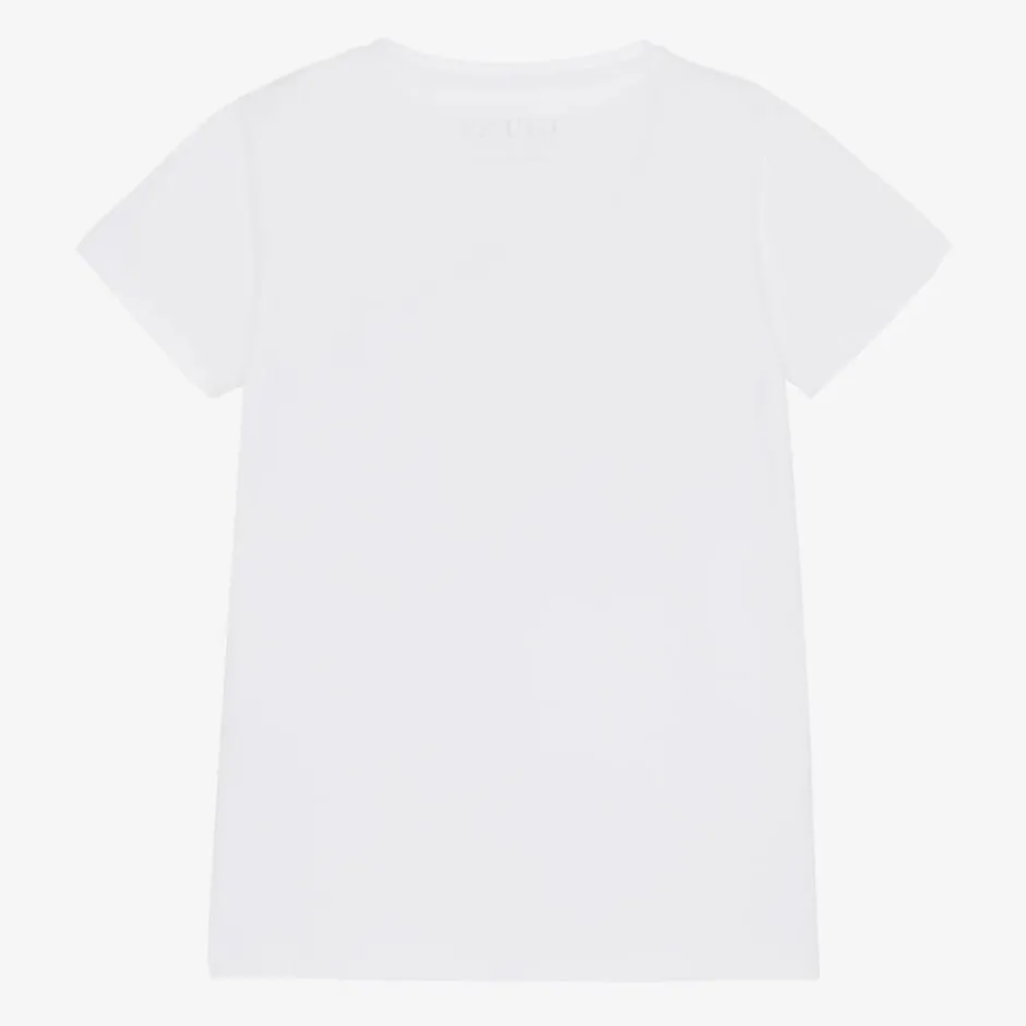 White T-shirt for junior girls by Guess, made in soft cotton jersey. This casual wardrobe staple features a glittery leopard print panel on the front with a glittery black and pink logo in the centre. This item contains organic cotton fibres.