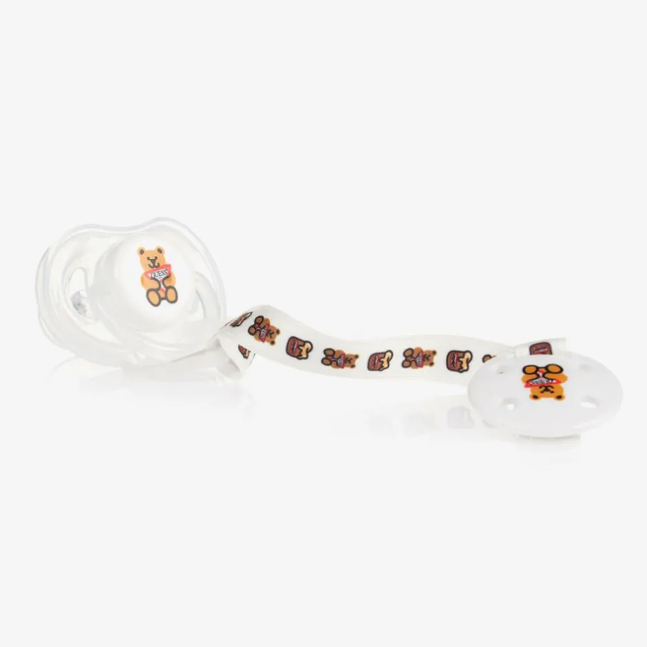 A white dummy and clip set for baby boys and girls by Guess, with sweet teddy bear prints. The set comprises a logo-branded dummy, a dummy clip and a protective logo case. Lovely for a new arrival, it is presented in a branded box.