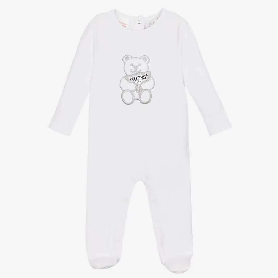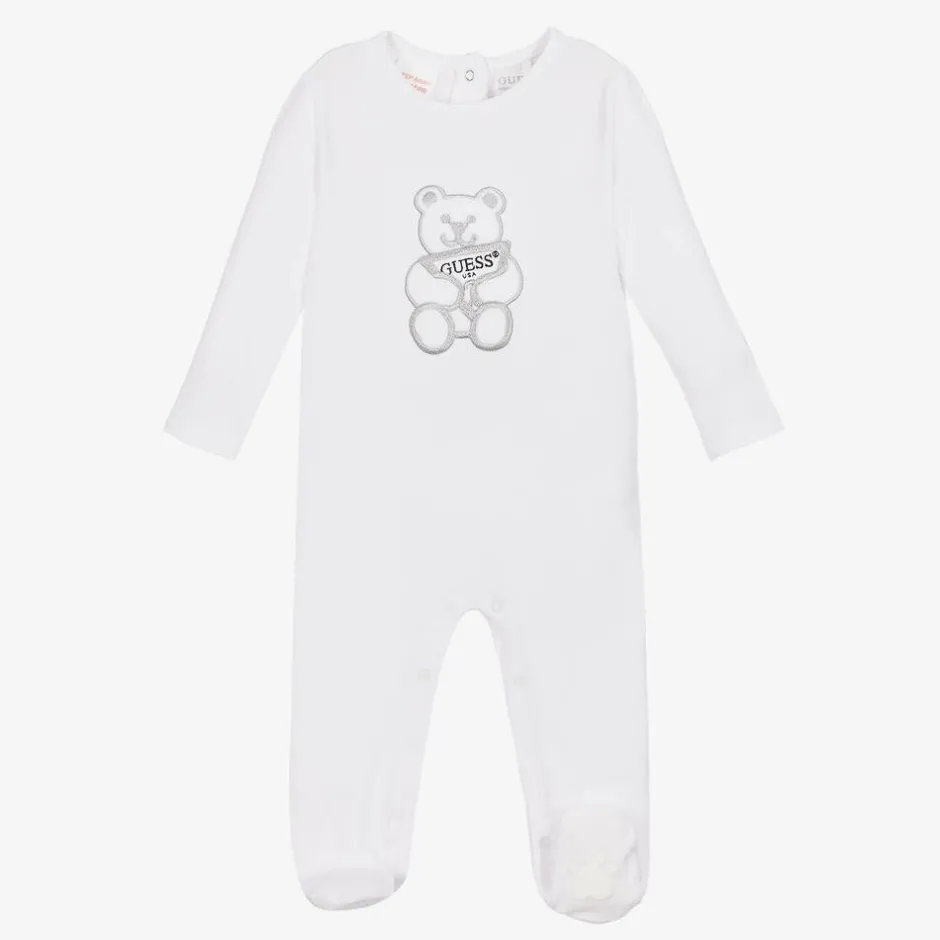 An adorable white babygrow for boys and girls by Guess, made in soft and stretchy cotton jersey. Kind and gentle on delicate skin, this comfortable one-piece has a teddy bear motif on the front in metallic silver embroidery. Popper fastenings on the back and between the legs make dressing and changing easier. This item is made with organic cotton fibres and comes with a cute, branded gift box.
