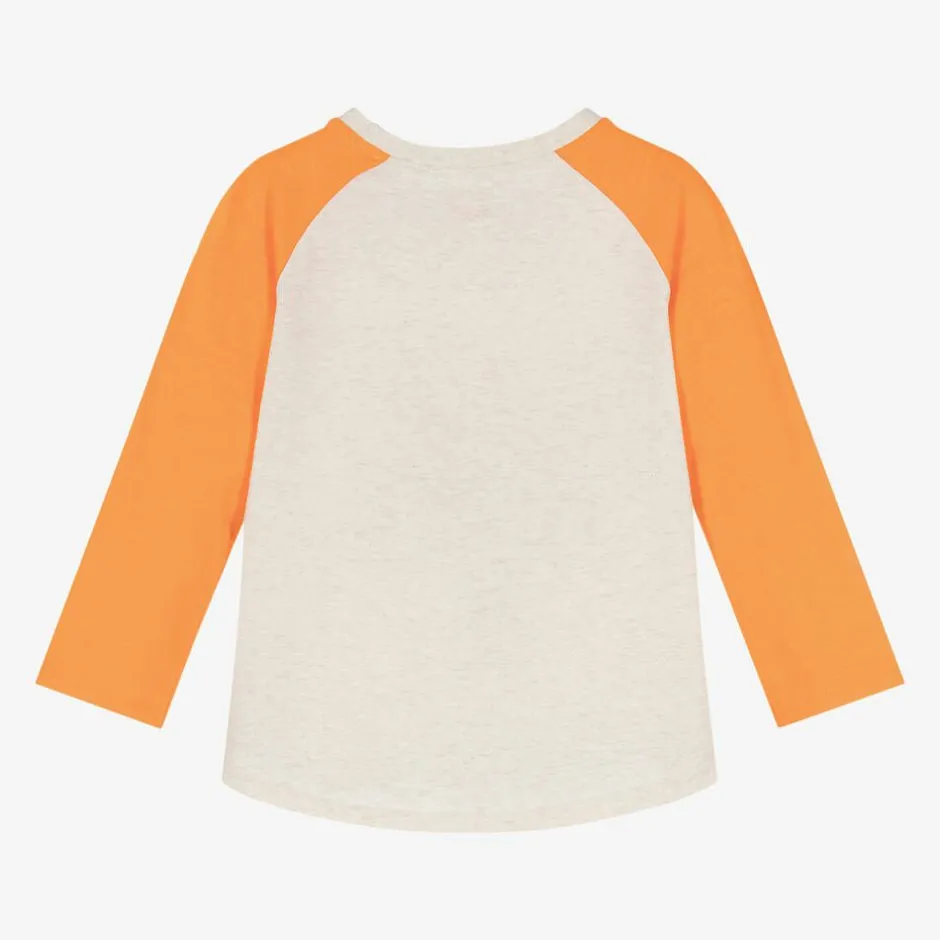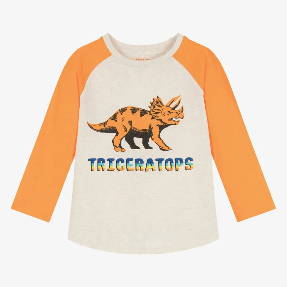 Orange and beige long-sleeved top for boys by Hatley, made in soft and comfortable cotton blend jersey. Styled with a crew neckline and raglan sleeves, this casual top has an orange dinosaur printed on the front, with 'Triceratops' printed below in blue, yellow and orange stripes.