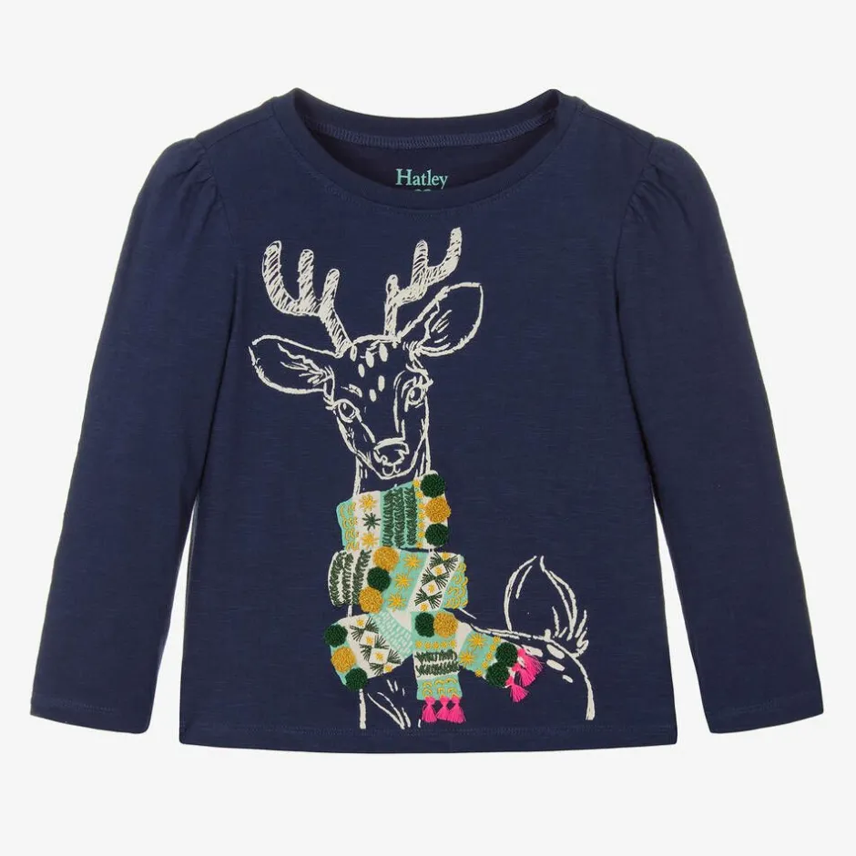 Cute navy blue top for girls by Hatley, made in soft cotton jersey. It has a sweet reindeer graphic on the front, wearing a snuggly scarf with pom-poms and tassels.
