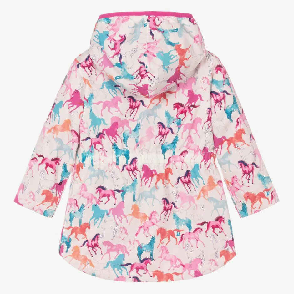 Pink and white raincoat for girls by Hatley, patterned with a playful horse print. Ideal for rainy days, this outerwear piece has a water repellent coating and is lined in soft polar fleece for warmth. It fastens with a smooth zip on the front, and has elasticated trims on the waist to keep out cold chills. There is a reflective logo badge stamped on one sleeve for improved visibility.