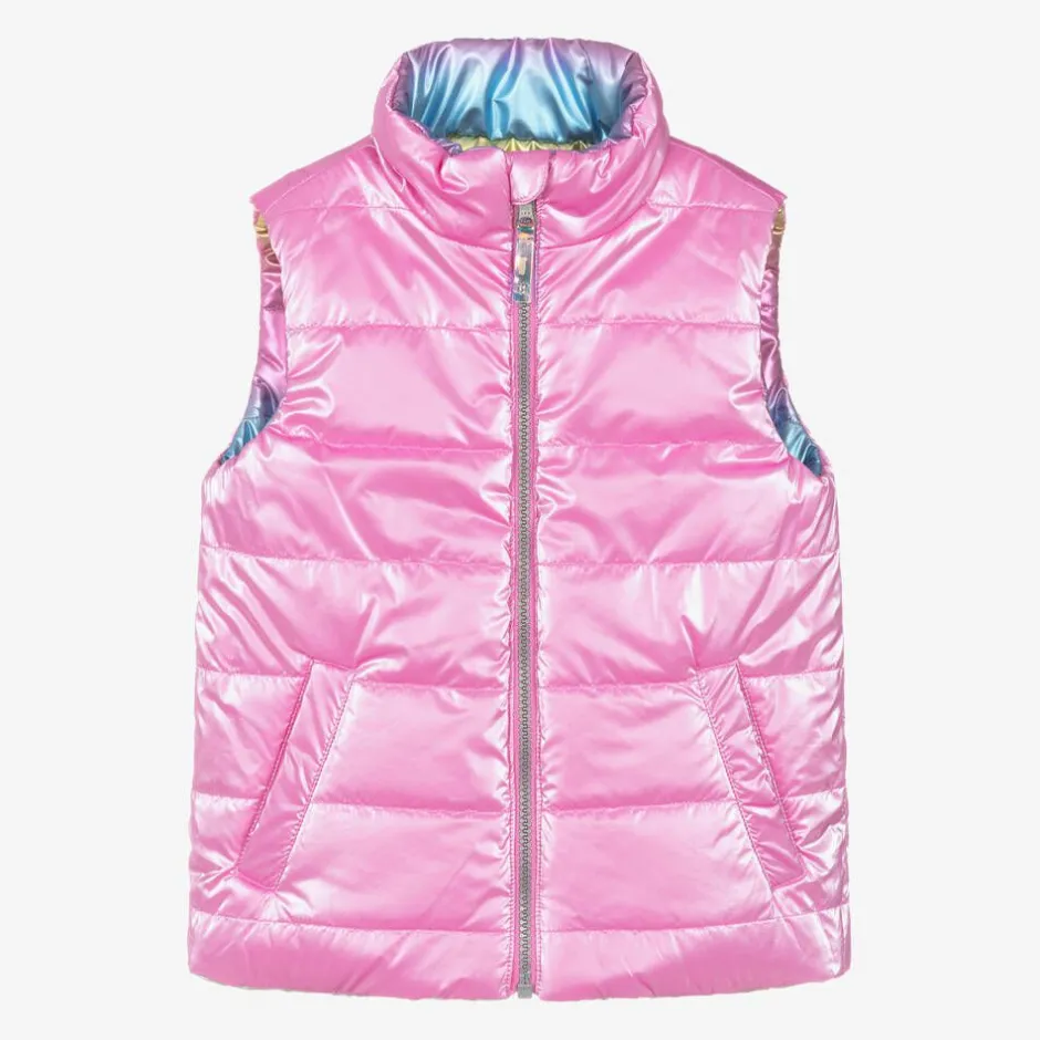 A fun and eye-catching reversible puffer gilet for girls by Canadian brand, Hatley. One side is in metallic rainbow ombré colours and the reverse side is glossy pink with a cool lightning bolt appliqué on the back. Smooth and lightly padded, this vibrant layering piece has pockets on both sides and fastens with a chunky silver zip.