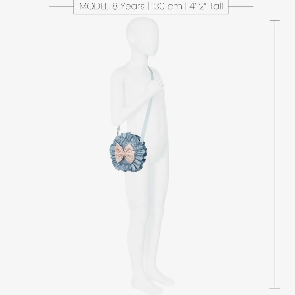 Beautiful, glittery blue bag for girls by Hucklebones London, in a circular design with lovely ruffle trim and a pink satin bow on one side. The small zip-fastening compartment has a quilted beige lining and there is an adjustable blue grosgrain ribbon shoulder strap. An embroidered logo tab on the back adds a designer finish.