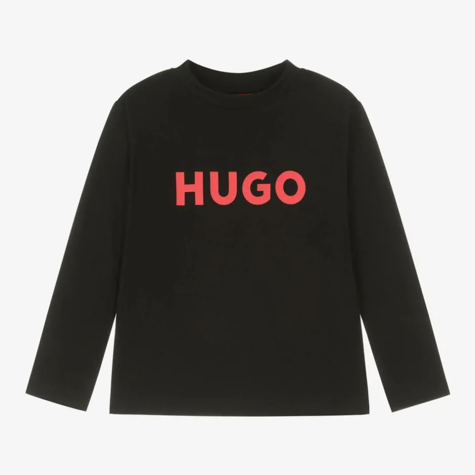 A black top for boys by HUGO, made in soft organic cotton jersey. This casual top is simply styled with a crew neck and long sleeves. The designer's name is displayed boldly on the front in red print for instant brand recognition.
