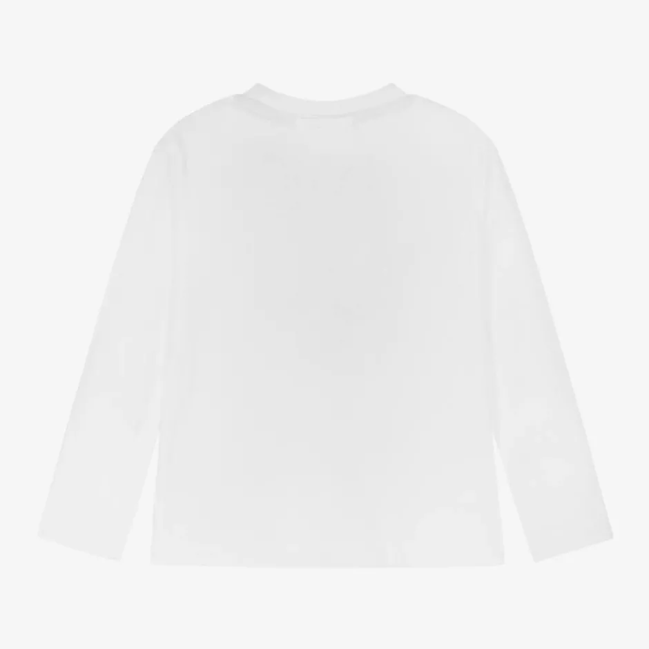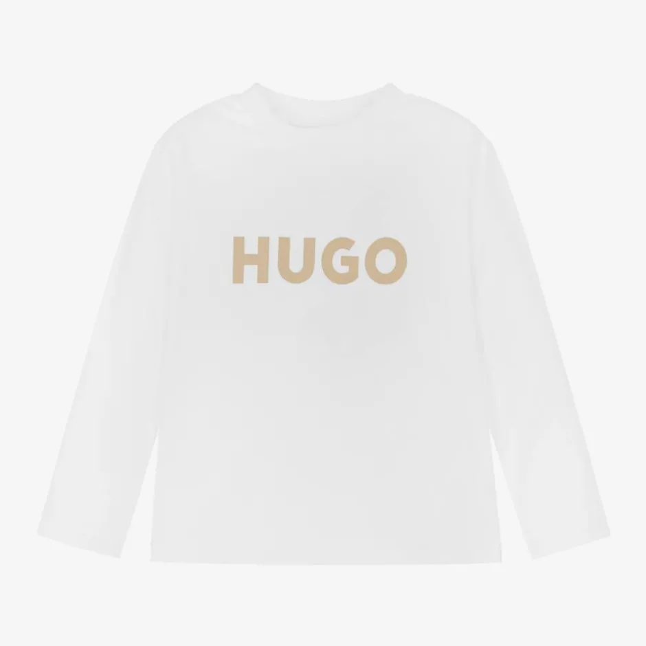 A white top for boys by HUGO, made in soft organic cotton jersey. This casual top is simply styled with a crew neck and long sleeves. The designer's name is displayed boldly on the front in beige print for instant brand recognition.
