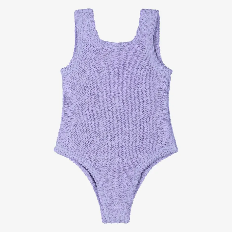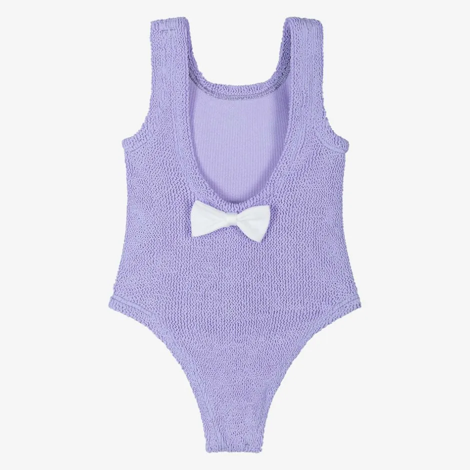 Adorable lilac purple Mini-me swimsuit for girls by British brand Hunza G, inspired by the adult collection. Made in the designer's Original Crinkle fabric, this one-piece has a square neckline and a scooped back decorated with a white bow. The material offers effortless stretch so that the swimsuit fits your child as they get older.