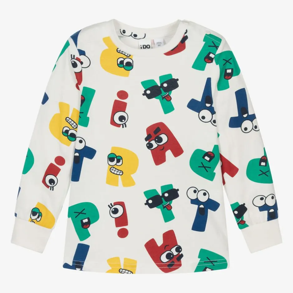Casual long-sleeved ivory cotton top for boys by Italian brand iDO Baby, made in soft, comfortable jersey. It has neat, ribbed trims and is patterned with colourful letters that have funny faces. There are poppers on one shoulder to make dressing easy.