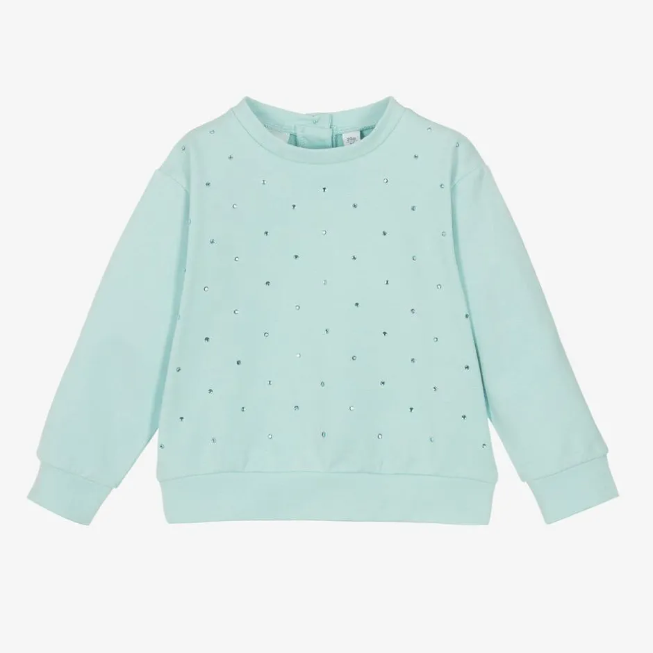 An aqua blue long-sleeved sweatshirt for girls by iDO Baby, made from soft cotton jersey. Beautifully decorated with tonal diamanté embellishments on the front for added sparkle, it fastens with branded buttons on the back.