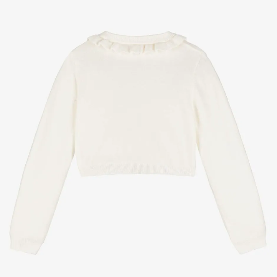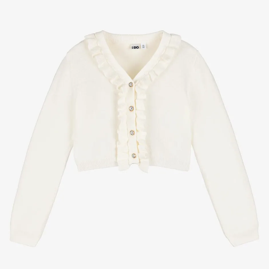 A sweet ivory cardigan for girls by iDO Baby, made in a beautifully soft viscose blend. It has pretty frill detailing and sparkling crystal-effect buttons for added charm. It has a smart V-neckline and can be easily layered over dresses and blouses for extra coverage.