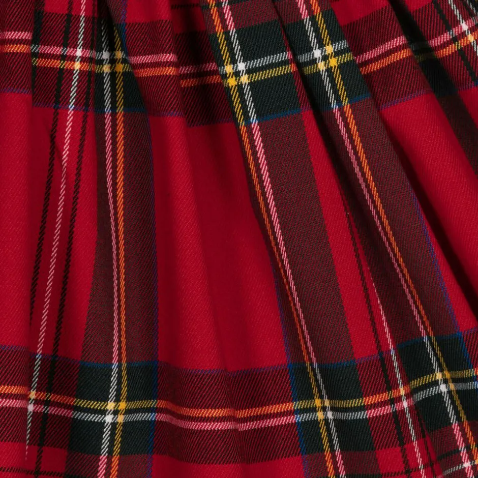 Classically styled, this red short-sleeved dress for girls by iDO Baby is patterned in the timeless Royal Stewart tartan. Made from a smooth cotton-blended twill, it is lined in lightweight cotton with a panel of structured tulle for enhanced volume in the gathered skirt. Fastening with a concealed zip on the back, it has a detachable velcro-fastened belt with a fixed bow detail on the back for a sweet finish.