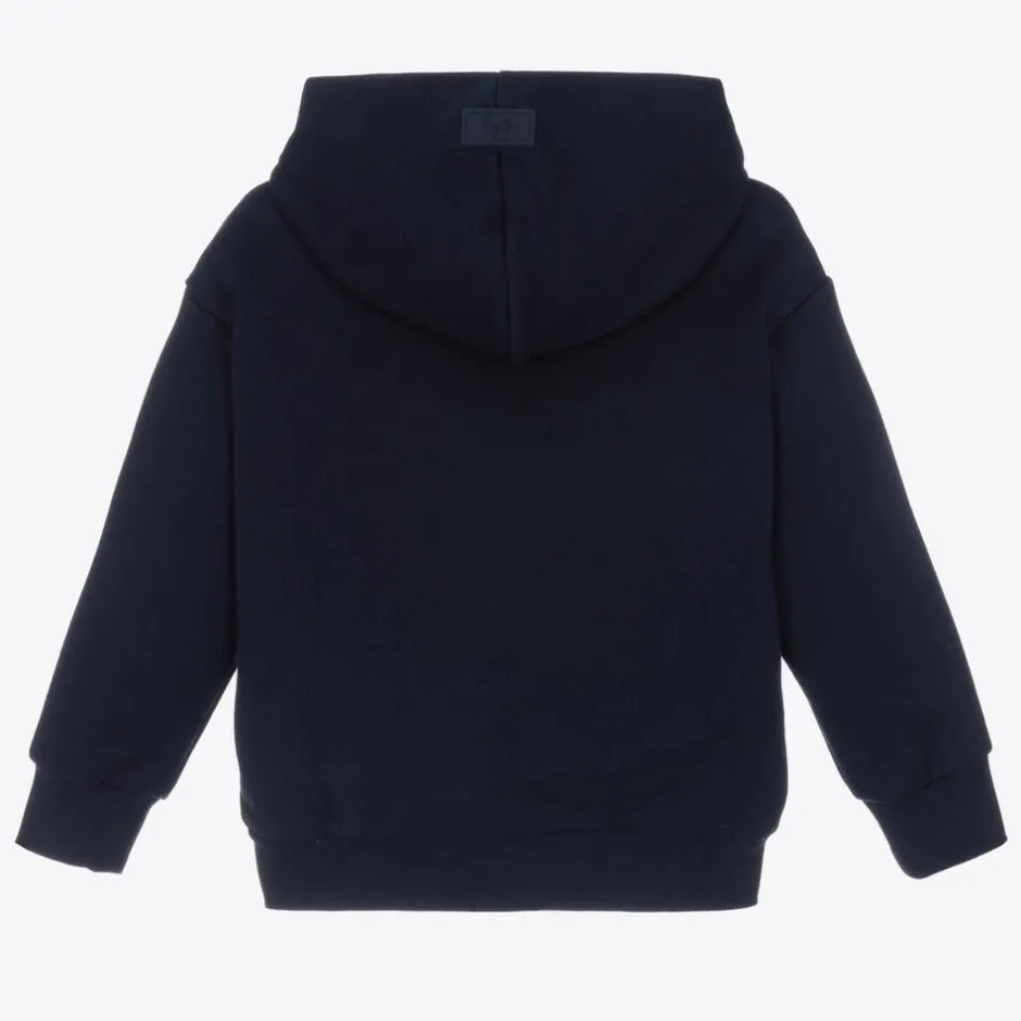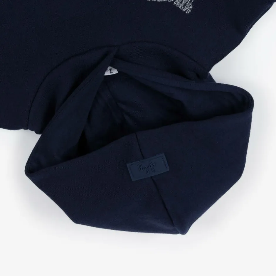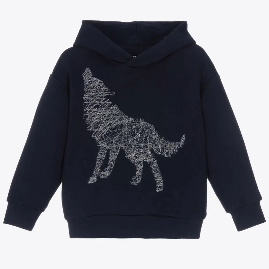 Navy blue cotton hoodie for boys by Italian brand Il Gufo, with a large embroidered grey wolf on the front. Made in soft, comfortable jersey with a warm, fleecy inside, it has ribbed trims for extra cosiness.