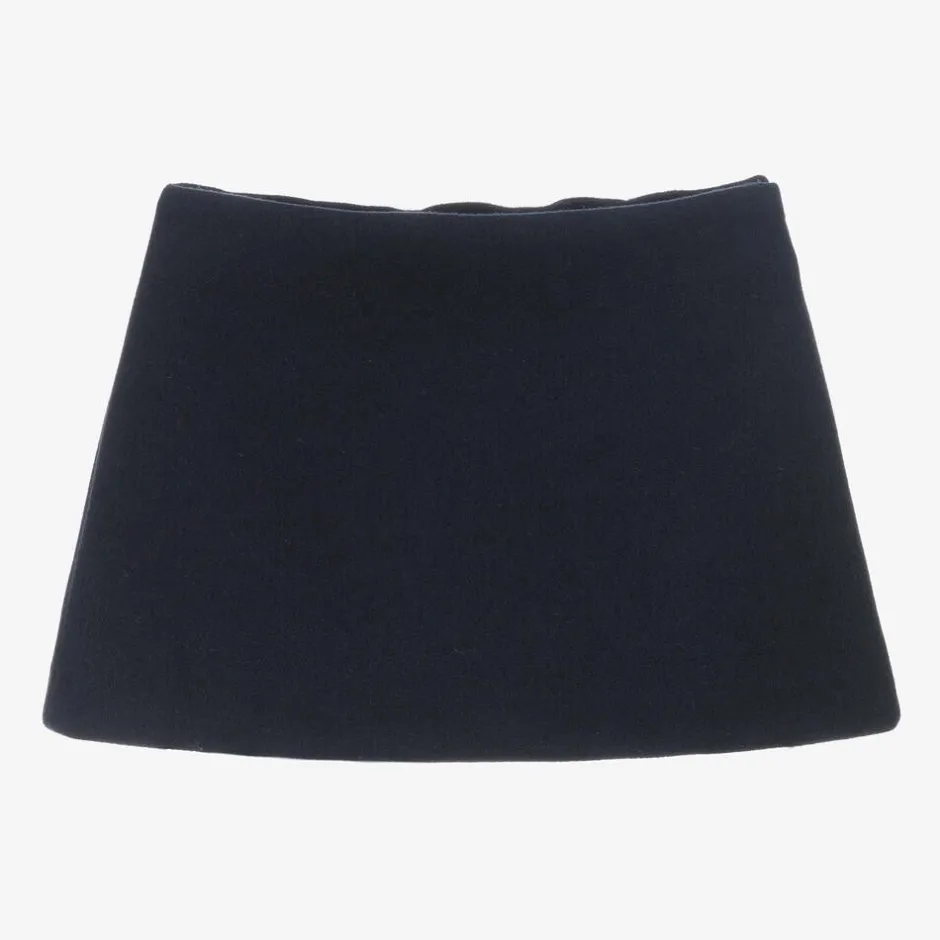 Navy blue mini skirt for girls by luxury Italian label, Il Gufo. Combining style and comfort, it is made in soft and stretchy jersey, with a mid-weight, felted wool feel. Fastening with a concealed side zip, the skirt has a partially elasticated waistband, adjustable for a great fit.