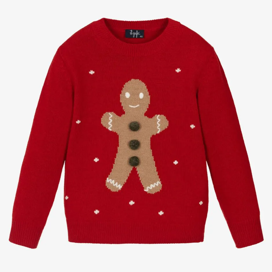 Cosy red sweater for boys and girls by luxury Italian brand Il Gufo, lovely for the festive season. Knitted in luxuriously soft, virgin Merino wool, it has an intarsia gingerbread man on the front, trimmed with fluffy pom-poms and surrounded by little white snowflakes.