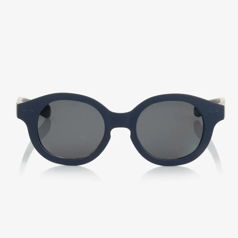 Navy blue sunglasses for boys and girls by French brand IZIPIZI, with retro style matte plastic frames. With 100% UV protection, the grey polarised lenses have a category 3 filter to protect against the bright sunshine. Smaller sizes come with a detachable pink silicone strap, to help keep them securely in place on your little one's head.