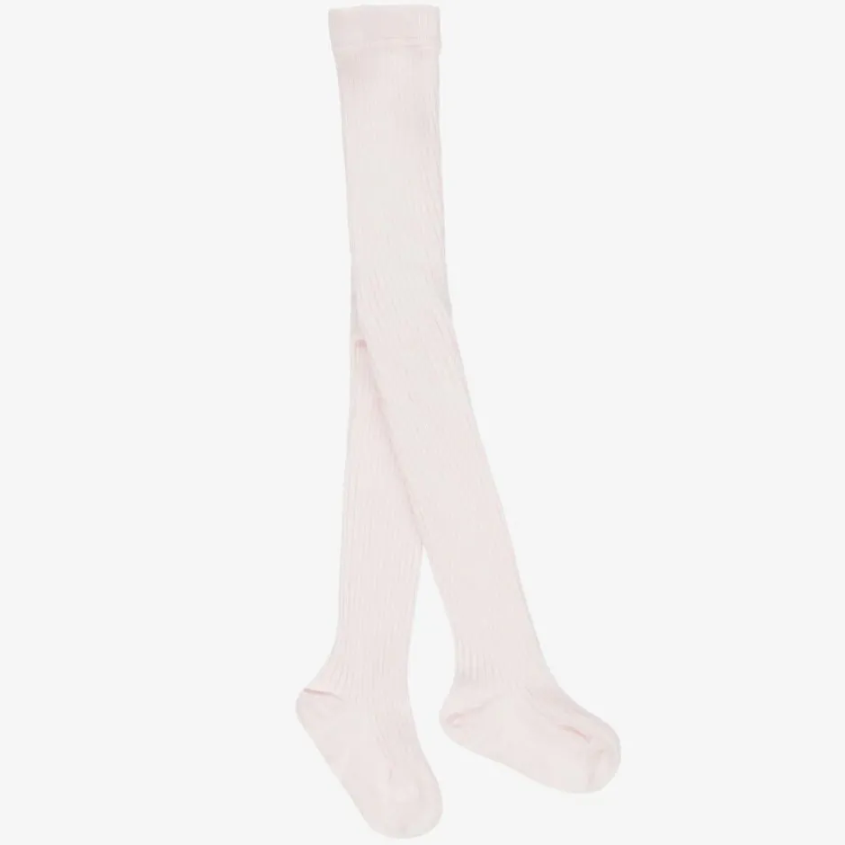 Pale pink ribbed tights for younger girls by French brand, Jacadi Paris. Soft and stretchy, they are made from cotton for all-day comfort.