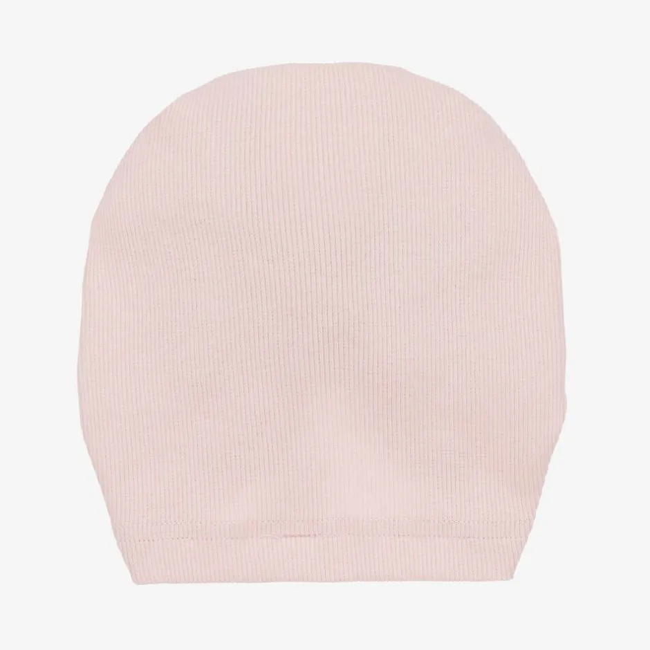 A sweet light pink turban for baby girls by Jamiks, made from soft and stretchy cotton jersey. Designed with style and comfort in mind, this ribbed hat has a decorative bow on the front with pretty crochet lace trims.