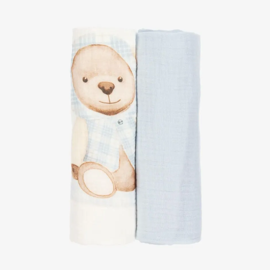 A two-pack of muslin cloths for baby boys from Jamiks, in ivory and blue organic cotton. One is patterned with an adorable teddy bear, balloon and toy train, while the second is plain.