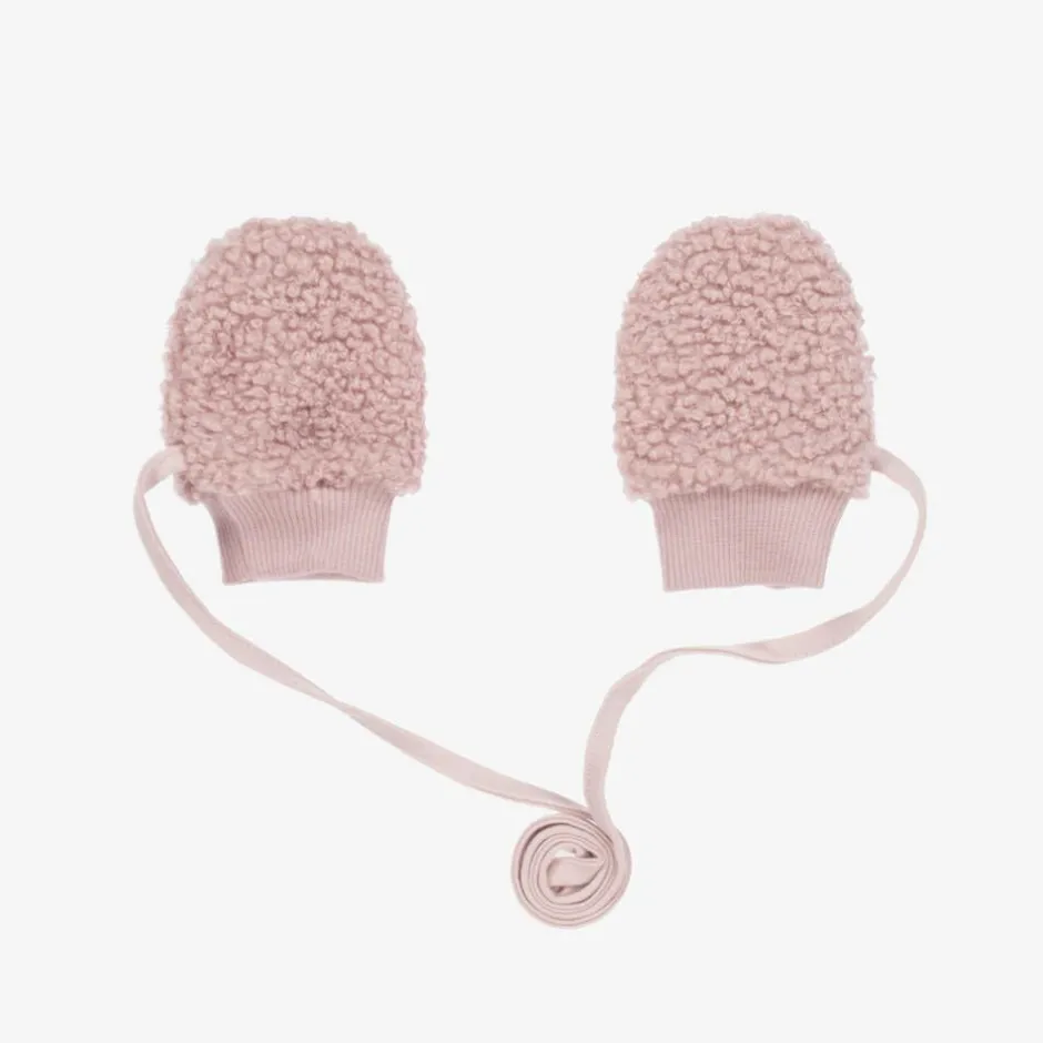 Dusky pink bouclé mittens for baby girls from Jamiks. The beautifully soft ribbed cuffs and cotton jersey lining ensure they fit comfortably on tiny hands. The attached strap threads through the sleeves of their coat or jacket to keep the mittens safely together.