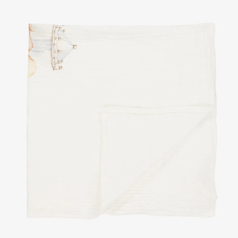 A two-pack of muslin cloths for baby girls from Jamiks, in ivory and pink-beige organic cotton. One is patterned with a charming carousel horse and stars, while the second is plain.