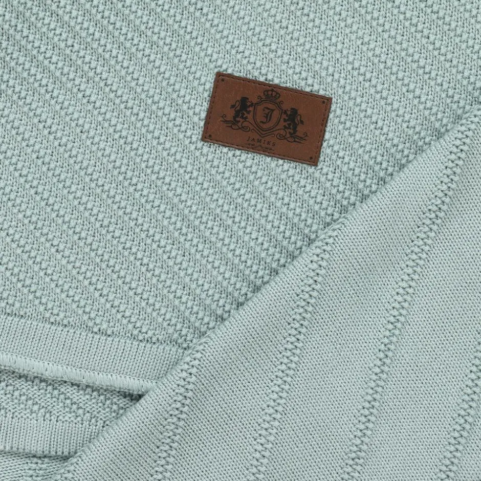 Pale green blanket for baby boys and girls by Jamiks, made in super soft viscose. Knitted with a geometric, striped pattern, it is ideal for use in the cot or when out and about in the pram or car seat. It has a brown, eco-leather logo badge sewn on one side.