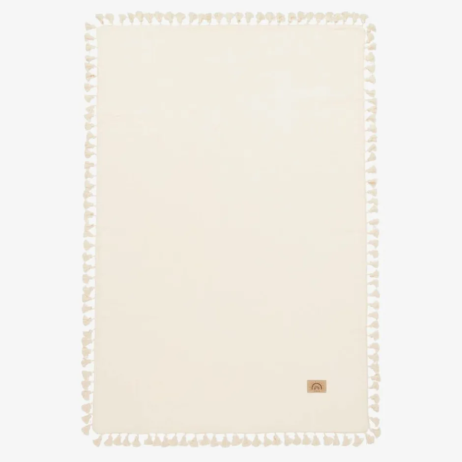 Lovely dark ivory swaddle for baby boys and girls by Jamiks. Made in a double layer of soft organic cotton muslin that is gentle against delicate skin, it has a sweet tassel trim and a logo patch in one corner. This versatile nursery accessory is ideal as a swaddle, a nursing cover, or an absorbent burping cloth.