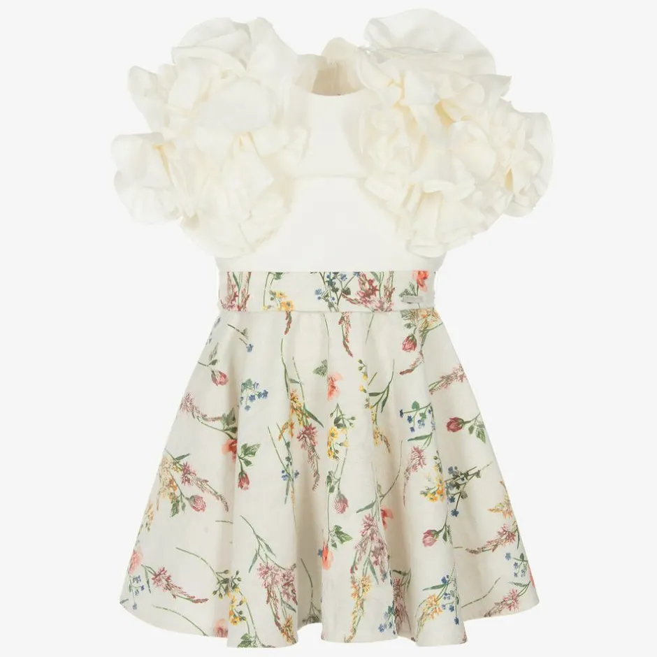 Exclusive to Childrensalon, a special occasion ivory dress for girls by British designer Jessie and James London. The cotton twill bodice has voluminous ruffled sleeves and the beautifully flared, floral jacquard skirt has a fixed belt detail with a metal logo tab. Comfortably lined in lightweight cotton, the dress fastens with a concealed zip and a button on the back.