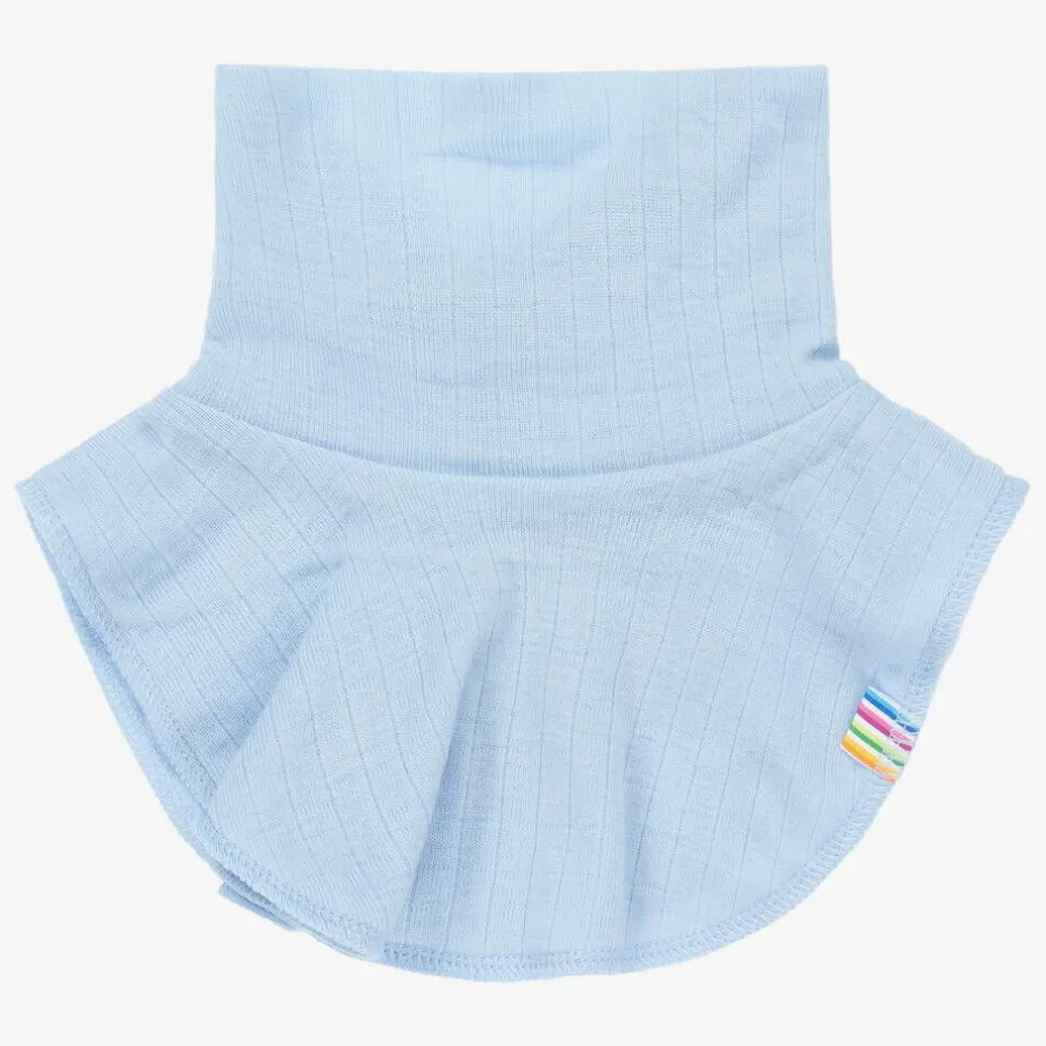 Super soft blue neck warmer for little boys and girls by Joha, made in fine Merino wool knitted jersey. Ideal for keeping little ones warm, it has a roll neck and a striped logo tab on the seam.